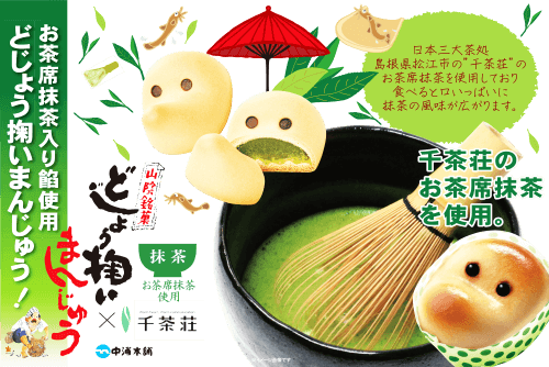 安来節に合わせて踊る『どじょう掬い』に使うひょっとこ面をデザインした、ひょうきんで親しみを感じる山陰を代表する銘菓 どじょう掬いまんじゅう。地元の老舗お茶屋 千茶荘さんとのコラボ商品。程よい甘さに抹茶のほろ苦い風味とコクが広がりさらにおいしくなりました。
