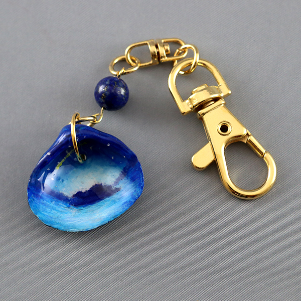 宍道湖産のしじみを丁寧に処理し、手描きで制作した後、レジンコーティングして一つずつ天然石”ラピスラズリ”を付け、キーホルダーに仕上げました。